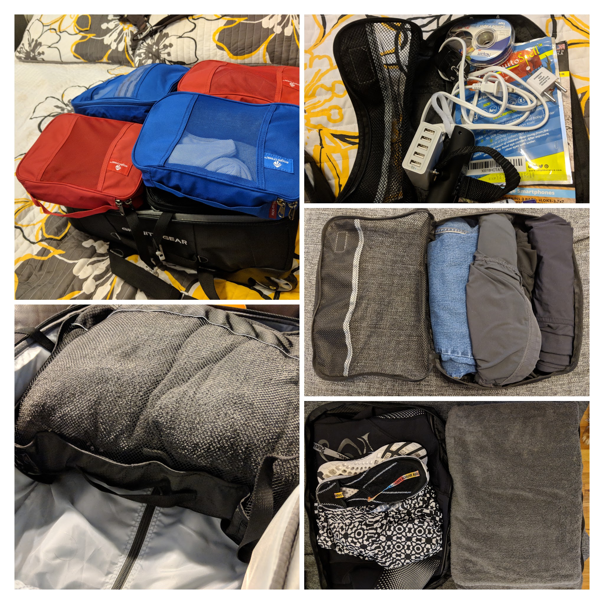 A’aight, let’s get to the actual packing. A few trips ago, I discovered packing cubes. For those of you with an organized mind, you would wonder what in the world these little bags get you but I assure you, they are a GAME changer. Not only do they keep your stuff very neatly organized, but they compress your items to save space, and they make it extremely handy to just grab the bag you need for that day. For example, if I’m traveling to multiple climates, I might have a cube of warm weather items and a cube for colder days. For this trip, it was super simple: electronics and misc in one, pants in another, PJs in one, socks and undies in another, etc…
